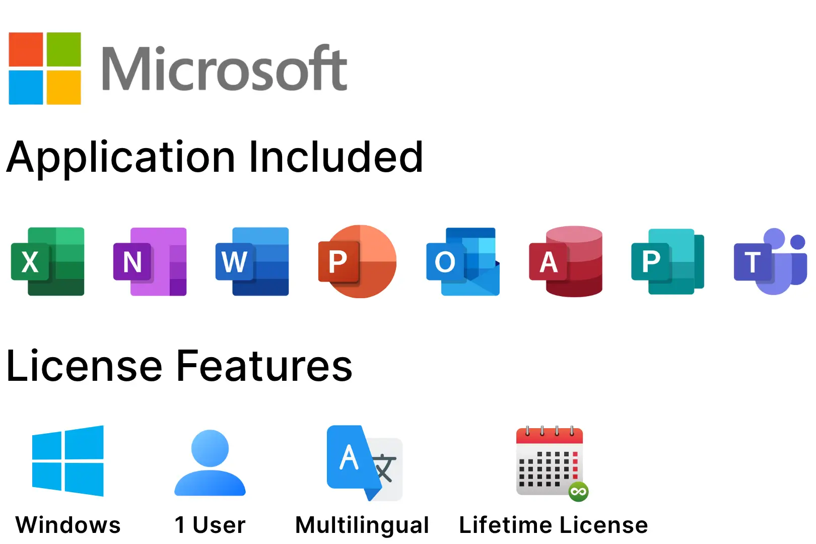 - Full Suite of Office Apps – Word, Excel, PowerPoint, Outlook, Publisher, Access, Teams.